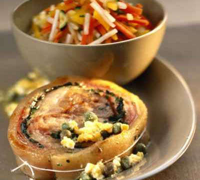 - 2Egoutter la tête de veau, ôter la ficelle, la mettre bien à plat et la 'farcir" du mélange d'herbes et de moutarde jaune.Rouler à nouveau la tête et l'attacher avec la ficelle de cuisine.L'envelopper de film alimentaire et la mettre à reposer 2 jours au réfrigérateur.