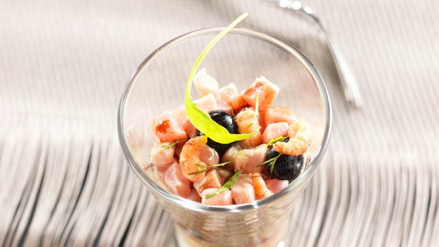 Avant de servir, saler, poivrer, mélanger et mettre en verrines décorées d'une feuille de roquette.