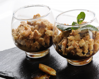 Monter le crumble en mettant les bananes au fond des plats, le chocolat fondu par-dessus et terminer par le crumble.