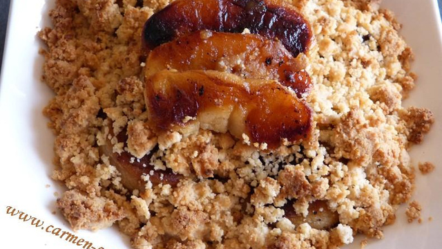 Préchauffer le four à 210 °C (th.7). Répartir les pommes dans 2 ramequins allant au four. Ajouter le boudin blanc sur les pommes puis saupoudrer de la pâte à crumble. Servir accompagné d'une salade verte.