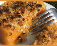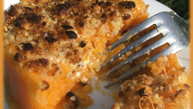Un délicieux croustillant au Roquefort sur une purée de courge agréablement persillée de ce fromage.