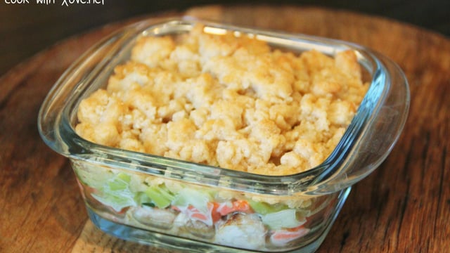 Dans un saladier, mélanger le beurre mou, la farine et le parmesan et faire sabler avec les mains. Répartir cette pâte sur les cocottes. Cuire le crumble environ 20 minutes dans un four préchauffé à 180°.