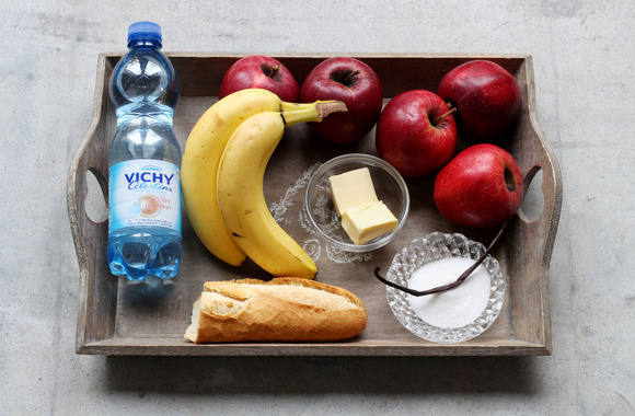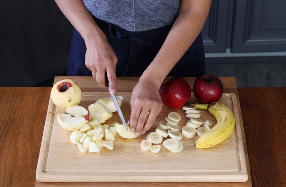 2Coupez les bananes en rondelles. Épluchez 4 pommes puis coupez-les en petits dés.