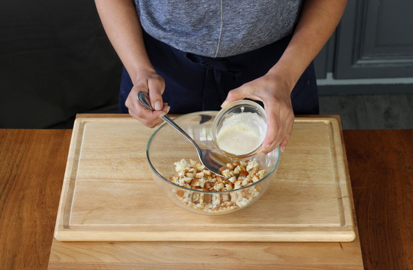 7Versez le beurre noisette sur le crumble de pain grillé. Mélangez.