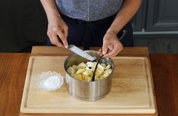 3Mettez les rondelles de bananes et les dés de pommes dans une casserole, ajoutez les graines grattées de la gousse de vanille et le sucre.