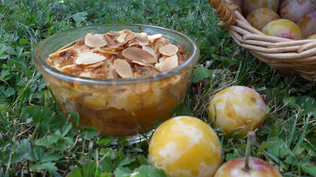 Versez les mirabelles dans un plat à gratin et ajoutez le mélange de miettes par dessus.