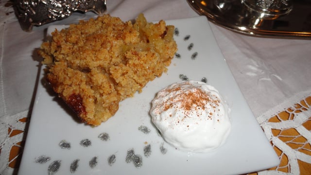 Servir tiède avec une glace à la vanille ou bien une crème fraîche fouettée. Comme vous pouvez le servir dans une coupe ou verrine.