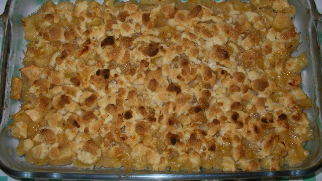 - 3Beurrer un plat allant au four.Y verser les pommes dans le fond.Emietter ensuite la pâte sur les pommes de manière régulière.