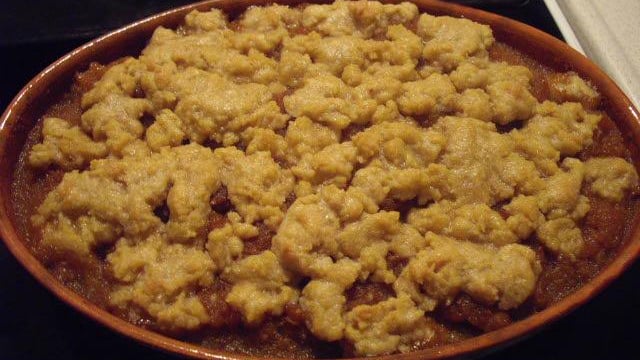 Mélanger la margarine, la farine (et les amandes c'est encore meilleur), le sel, et le sucre pour en faire une sorte de sable grossier puis répartir ce mélange sur la compote.