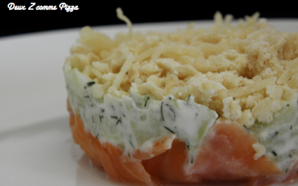 Dresser les crumbles : Tapisser le fond des cercles à pâtisserie avec le saumon fumé. Ajouter la couche à base de concombre en utilisant la totalité de la préparation. Recouvrir avec la pâte à crumble. Laisser refroidir puis mettre au frais environ 1h avant de servir.