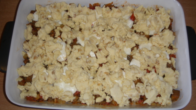 Mettez votre mélange aubergines/pommes de terre dans un plat (ou dans des cocottes individuelles). Déposez des tranches de mozzarella sur le dessus. Émiettez la pâte à crumble sur le dessus et enfournez pour 15 min.