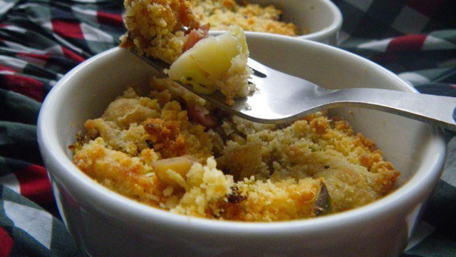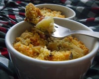 Du bout des doigts, mélanger le beurre avec le parmesan, la poudre d'amandes et la farine de châtaignes afin d'obtenir une pâte sablonneuse. Recouvrir les choux de Bruxelles avec cette pâte et enfourner 20 à 30 minutes à 180°C.