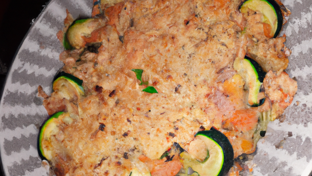 Répartissez les légumes dans le fond d'un plat à gratin, recouvrez de saumon et de crumble, faire cuire 15 mn jusqu'à ce que le crumble soit doré.