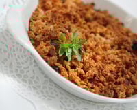 Confit de poivrons et de tomates coeur de boeuf avec quelques lardons surmontés d'un couverture de crumble. (entrée)
