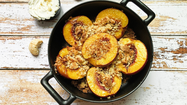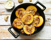 Ce crumble de nectarines se marie très bien avec un peu de mascarpone. Il suffit de servir une cuillère à soupe de mascarpone dans le creux de chaque fruit après cuisson, c'est un régal.