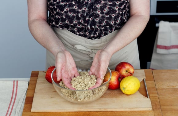 5Incorporez-le du bout des doigts. Vous devez obtenir une chapelure grossière mais qui s’amalgame quand vous pressez la pâte entre vos mains. Réservez au frais.