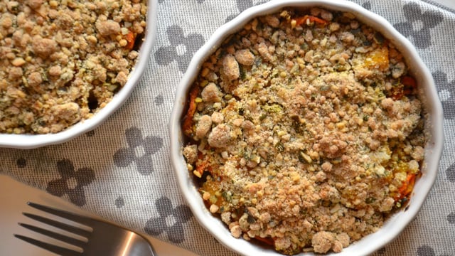La texture délicate et la douceur du potimarron ressortent en bouche pour vous offrir un plat original et délicieux, alliant le fondant (des légumes) et le croquant (du crumble).
