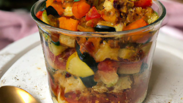 Ratatouille de courgettes, tomates, aubergine, oignon et ail sur un lit de crumble au parmesan.