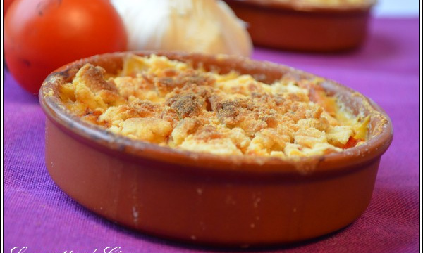 Préparez le crumble: mélangez la farine et le beurre en morceaux. Ajoutez l'ail haché, du sel. Puis répartissez dans les cassolettes.