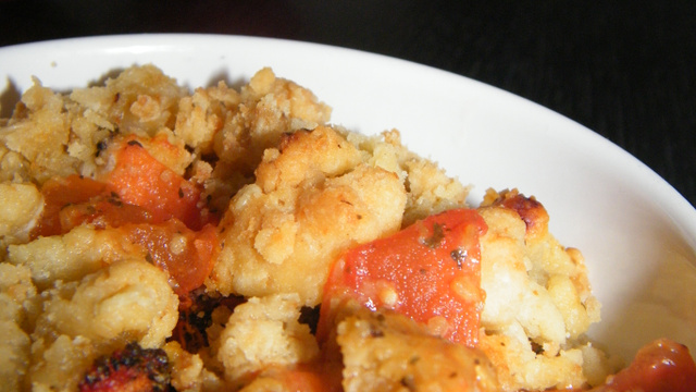 Lorsque les tomates sont fondantes et qu'il ne reste plus d'eau de cuisson, sortez-les du four et répartissez la pâte à crumble sur toute la surface.