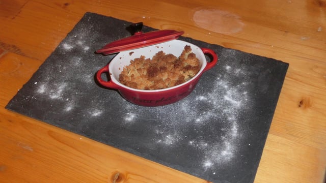 Mélanger la chapelure dorée, le sucre en poudre, la poudre d'amandes et le beurre. Malaxer la préparation avec les mains puis émiettez-là pour lui donner une consistance sableuse. Recouvrez la pâte uniformément.