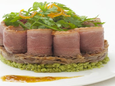 2 Fois. Porter à ébullition le sucre avec 2 dl d'eau, plonger les zestes puis laisser cuire doucement 30 mn. A l'aide d'un cercle en inox, repartir un couche de crumble sur le fond de l'assiette, surmonter de l'effilochée de cuisse de canette sans tasser à l'aide d'une fourchette. Déposer harmonieusement les fines tranches de canette, répartir les fines herbes et les jeunes pousses de salade, les zestes d'orange, l'huile de mandarine et quelques gouttes de jus de cuisson des cuisses.