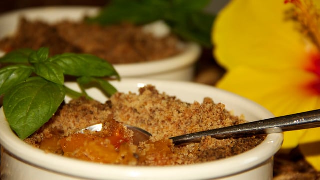 Répartir les abricots dans des ramequins ou petits plats qui passent au four, disposer le crumble dessus et enfourner. Laisser cuire le temps d'obtenir une jolie coloration dorée (ou plus pour ceux qui aiment le côté : grillé). Les crumbles peuvent être servis avec de la glace vanille ou amande.