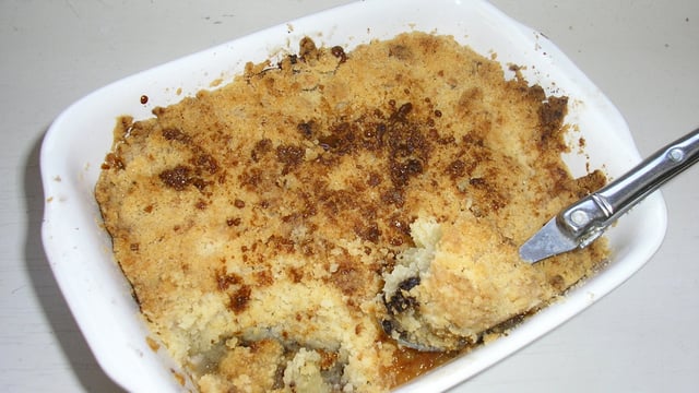 Dans un plat à four, mettre les fruits, parsemer de chocolat et recouvrir de pâte.
