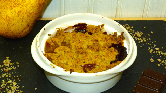Déposer les morceaux de poire et les carreaux de chocolat dans des ramequins puis émietter la pâte à crumble sur les fruits.