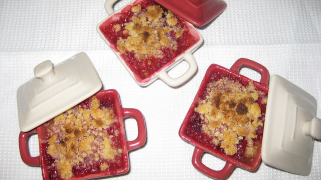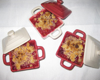 Remplir des cassolettes individuelles du mélange rhubarbe-fruits rouges, puis recouvrir du crumble.