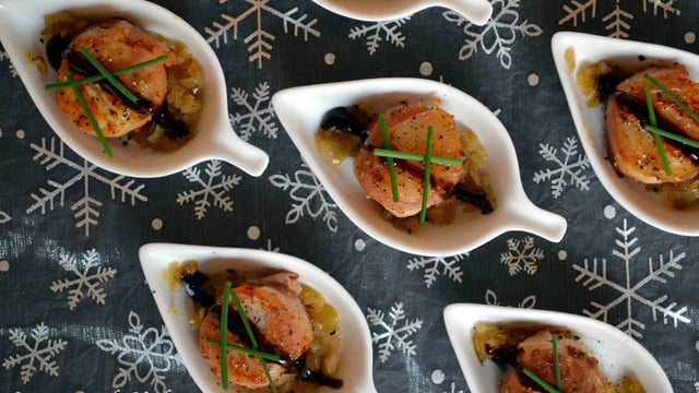 Partagez les échalotes confites dans chaque coupelle, déposez-y les Saint-Jacques, poivrez, ajoutez un trait de crème de balsamique et décorez avec un peu de ciboulette.