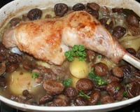 Après encore une vingtaine de minutes disposez les marrons autour de la cuisse, arrosez la du jus de cuisson, ajoutez un peu d'eau si nécessaire.