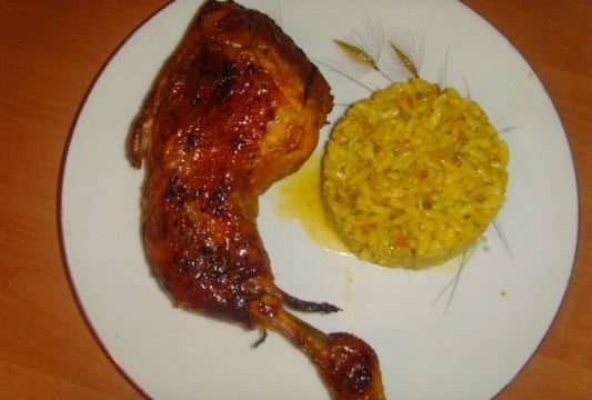 Disposer sur l'assiette le riz à l'aide d'un cercle à pâtisserie puis la cuisse de poulet.