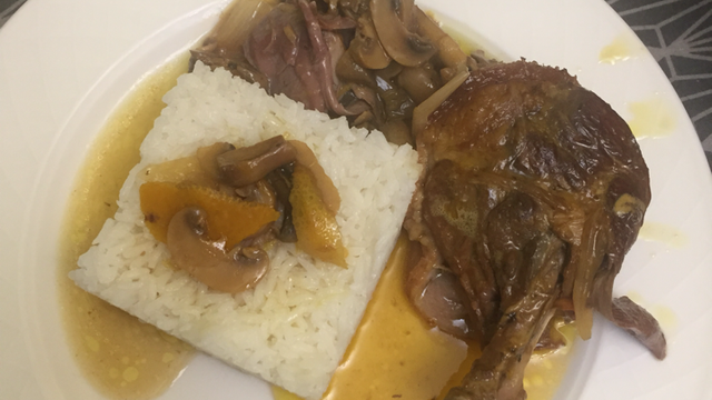 Cuisses de canard mijotées au vin blanc et champignons, accompagnées d'oranges.