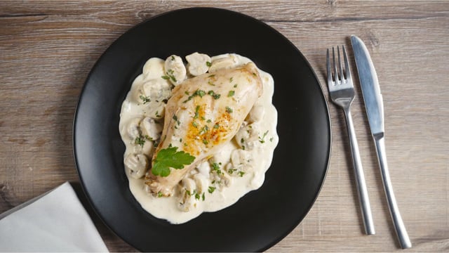 Hacher finement les échalotes. Éplucher et couper les champignons de Paris en deux. Couper le roquefort en dés. Dans une sauteuse, faire fondre le beurre et dorer les cuisses uniformément pendant 20 minutes.