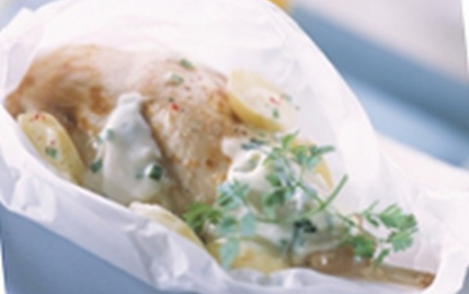 Préparez 6 grands carrés de papier sulfurisé et placez y les cuisses de lapin et les rondelles de pommes de terre. Répartissez la sauce dans les papillotes.