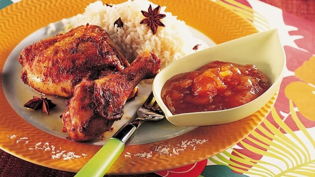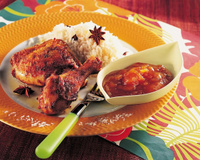 Servez les cuisses avec le riz et le chutney à la mangue.