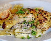 2Préparer la sauce aux champignons : dans un poêlon, verser la crème et ajouter les champignons. Porter à ébullitions et laisser frémir pendant quelques minutes. Ajouter la moutarde, le persil ciselé. Stopper le feu. Ajouter cette sauce aux pâtes cuites. Servir une assiette de pâtes couvertes d'une cuisse de poulet parsemée de persil ciselé.
