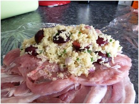 Préchauffez le four à 200°C. Atez la chair des cuisses de l'os. Placez la cuisse à plat sur votre plan de travail. A l'aide d'un petit couteau, faites une entaille au centre de la cuisse en suivant l'os. Écartez la chair de l'os en commençant par le haut de cuisse en grattant avec le couteau. Essayez de ne pas déchirer la chair. Faites pareil avec la deuxième cuisse. - 2Sur un film étirable, étalez les tranches de lard en les superposant au tiers de la précédente. Placez la chair des cuisses, salez légèrement et poivrez. Versez au centre du couscous et rabattez la chair sur le couscous en vous aidant du film étirable et roulez afin d'obtenir un ballotin.