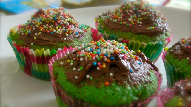 Lorsque les cupcakes sont un peu tiède, les napper avec la pâte à tartiner au chocolat et parsemer de paillette de bonbon de couleur (ou autre en fonction de vos goût).