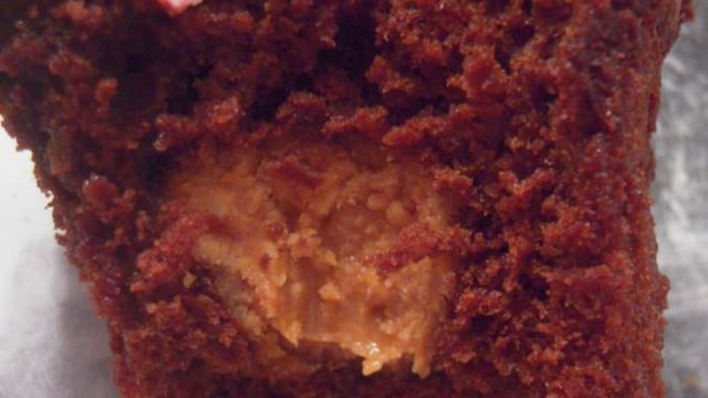 Délicieux cupcake au chocolat avec un cœur fondant au beurre de cacahuètes.