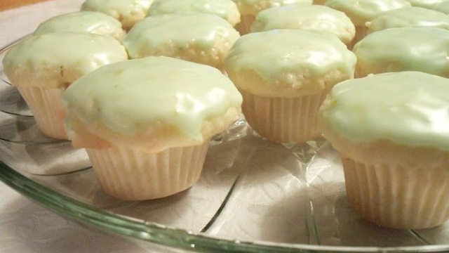 Pour la garniture, mélanger le sucre a glacé avec le zeste et le jus de lime, ajouter quelque gouttes de colorant vert et étendre sur les petits gâteaux.