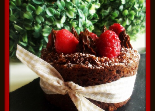 Le dressage: Démoulez les cupcakes. Retaillez-les pour obtenir une forme régulière, mixez les miettes obtenues. Quand ils froids, remplir le coeur avec le coulis et mettre quelques miettes pour cacher le coeur coulis. Disposez de la ganache et des framboise pour le décor. Soupoudrez de sucre glace.