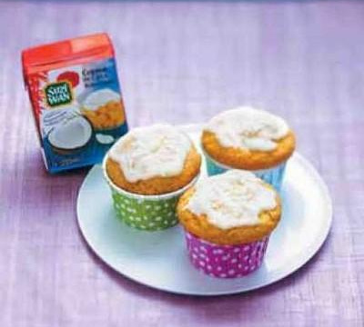 Préchauffez le four à 180°C (th.6). Fouettez le sucre et l'oeuf au batteur. Ajoutez le beurre fondu, la crème de coco et la farine au fur et à mesure. Terminez par la levure et la noix de coco râpée. Farinez et remplissez les moules à cupcakes aux trois quarts. Faites cuire au four 20 min. Les cupcakes sont cuits quand la lame du couteau ressort sèche du gâteau.