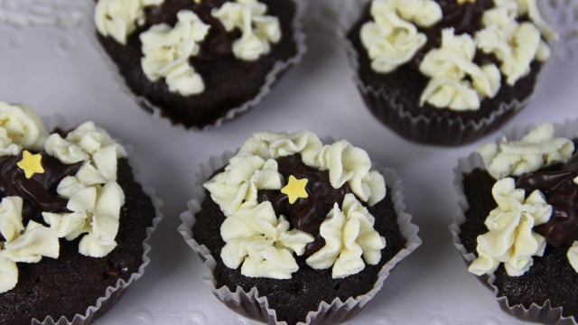 Avec une poche à douille cannelée, décorer le dessus des cupcakes. Attention, c'est l'étape qu'il faut à tout prix réussir. Pour varier, vous pouvez utiliser une douille plate. Saupoudrer de cacao ou de vermicelles en chocolat. - 5