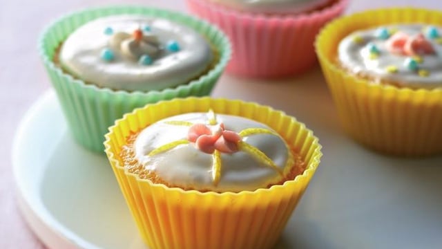Y incorporer les zestes de citron coupés très finement. Saupoudrer les cupcakes de sucre glace avant de les napper du glaçage au citron. Les décorer de billes de sucre colorées avant de les placer au réfrigérateur 1 heure minimum.