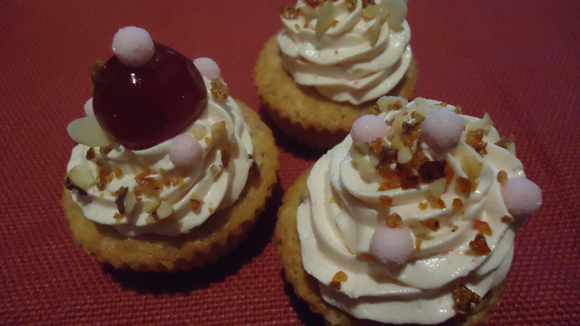 Enfin, étape finale, glacez les cupcakes grâce à la poche à douille de manière à ce que ce soit bien harmonieux, puis décorez ! (J'ai utilisé des amandes effilées, cerises confites, nougatine maison et perles de sucre roses et violettes, mais faites appel à votre imagination ! )