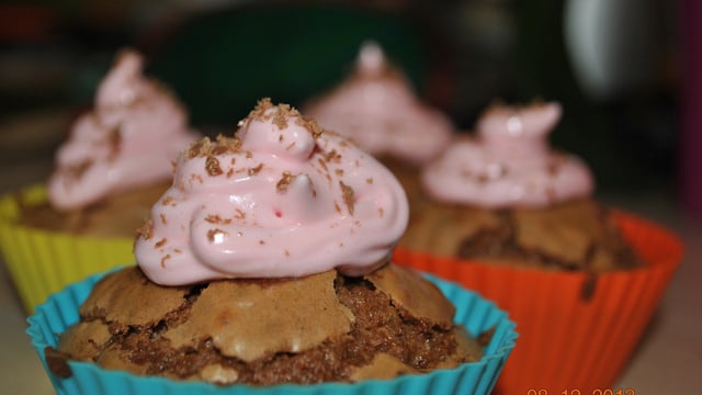 Pour le glaçage, battez les blancs en neige ensuite ajoutez le sucre et le colorant. Utilisez une poche à douille pour décorrer vos cupcakes Vous pouvez ensuite prendre un morceau de tablerone, et avec un couteau parsemez vos cupcakes