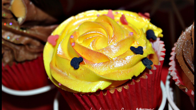 Montez en chantilly le mascarpone avec le sucre glace puis rajoutez le colorant. Décorez vos cupcakes une fois refroidis et saupoudrez de la poudre nacrée.