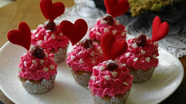 Prendre les cupcakes et à l'aide d'une petite cuillère, retirer un peu de pâte au centre, déposer 1 cerise et remettre le dessus de la pâte, déposer un peu de crème à l'aide de la poche àa douille et mettre une cerise au sommet (la sécher dans du papier absorbant au préalable). Parsemer de coeurs en sucre.